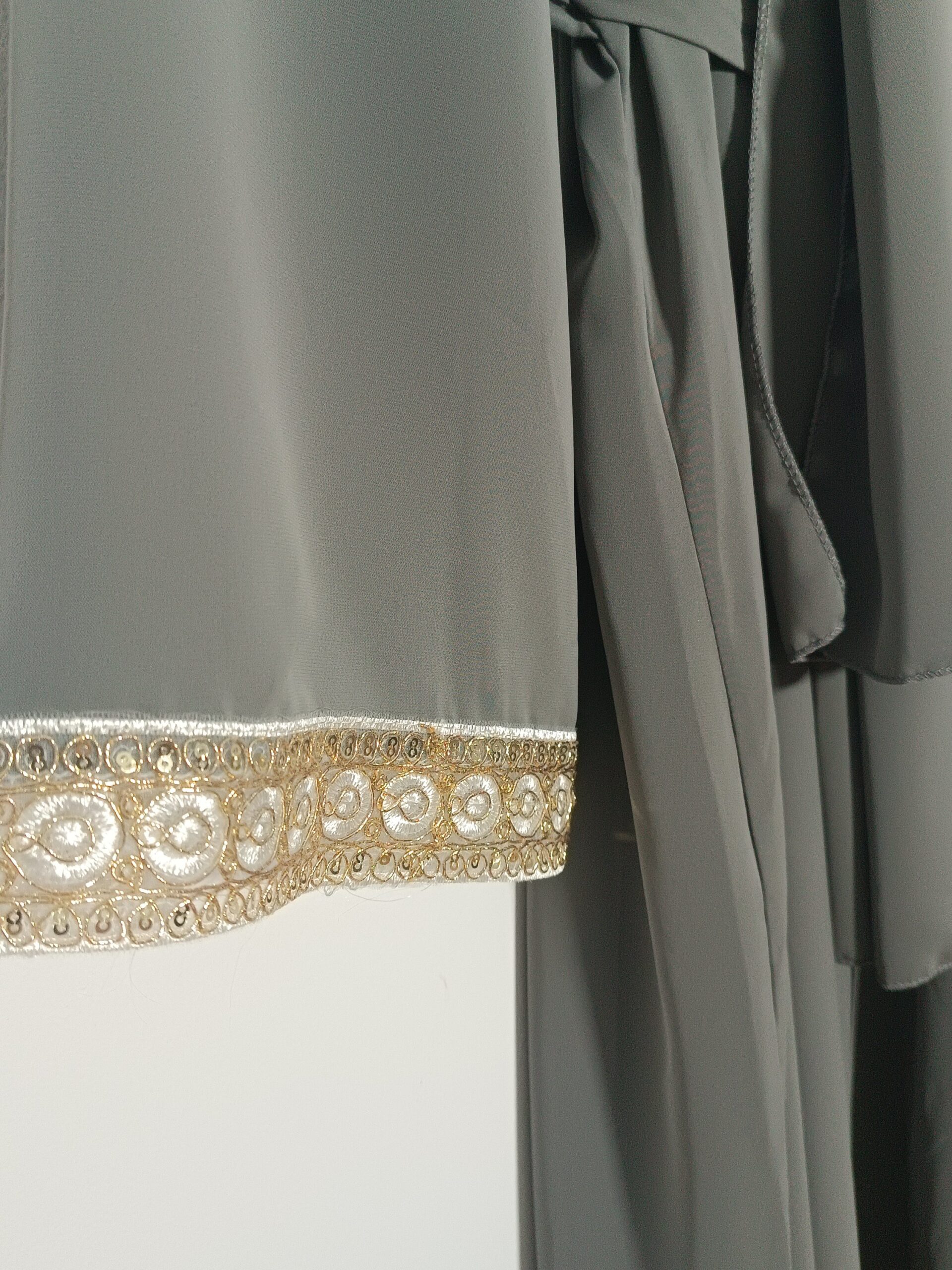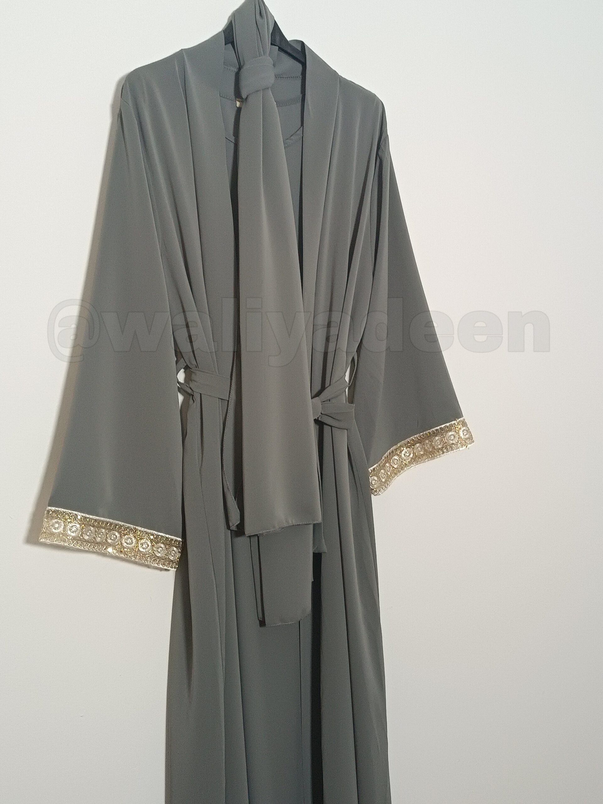 Descubre nuestro exclusivo Kimono Ensemble compuesto de 3 piezas en gris oscuro: elegante y modesto. Con detalles dorados, tela de satén de alta calidad y un vestido interior de manga tirante, perfecto para primavera y verano.